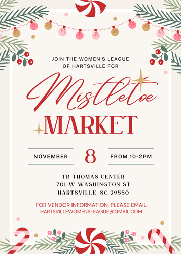 Event Description:The Women's League of Hartsville presents this year's Mistletoe Market at TB Thomas Center on November 8th from 10 AM to 2 PM. There will be over 25+ vendors ranging from clothing, sweet treats, jewelry, and MORE! Come get your Christmas shopping started and help give back to the Hartsville community at the same time! Santa Claus will also be joining us this year and we will have an entire kid's table dedicated to decorating an ornament for them to be able to take home with them! We will also have a silent auction this year with products, services, and gift cards to many of your local, Hartsville favorite businesses. We can't wait to see you!